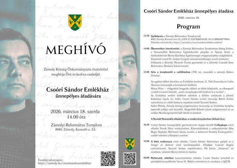 Zámoly történetének egyik legmeghatározóbb pillanatára készül: az éveken át méltatlanul elhanyagolt, romos Csoóri Sándor szülőház mostanra a nemzeti emlékezet csillogó ékkövévé vált, köszönhetően a polgármester állhatatos munkájának. Csoóri Sándor szellemi öröksége a megújult emlékházban él tovább, az egykori omladozó falak helyén egyedülálló kulturális központ született. Nagyszabású, egész napos ünnepségre készülnek, mindenkit várnak.
