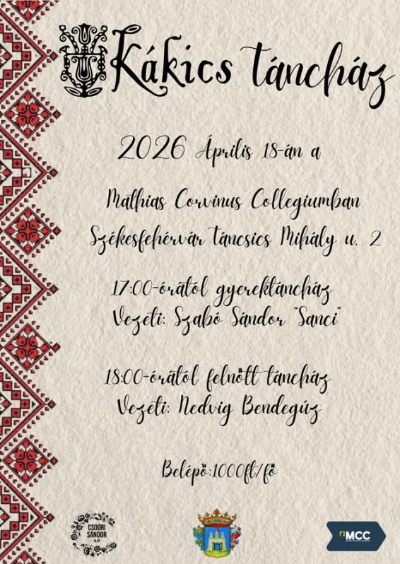 2026. március 14-én ünnepi forradalmi táncházzal folytatódik a Kákics táncház Székesfehérváron, a Mathias Corvinus Collegiumban. 17 órától a kicsiket, 18 órától pedig a táncolni vágyó nagyokat, fiatalokat és felnőtteket várjuk újra nagy-nagy szeretettel!