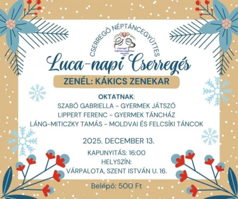 2025. december 13-án 16 órától zenés táncos cserregéssel, vagyis gyerek táncházzal és moldvai, felcsíki táncházzal ünnepeljük meg a Cserregő Néptáncegyüttessel és a Kákics Zenekarral Luca jeles napját Várpalotán. 16 órától a kicsiket, 17 órától pedig a táncolni vágyó nagyokat, fiatalokat és felnőtteket várjuk nagy-nagy szeretettel!